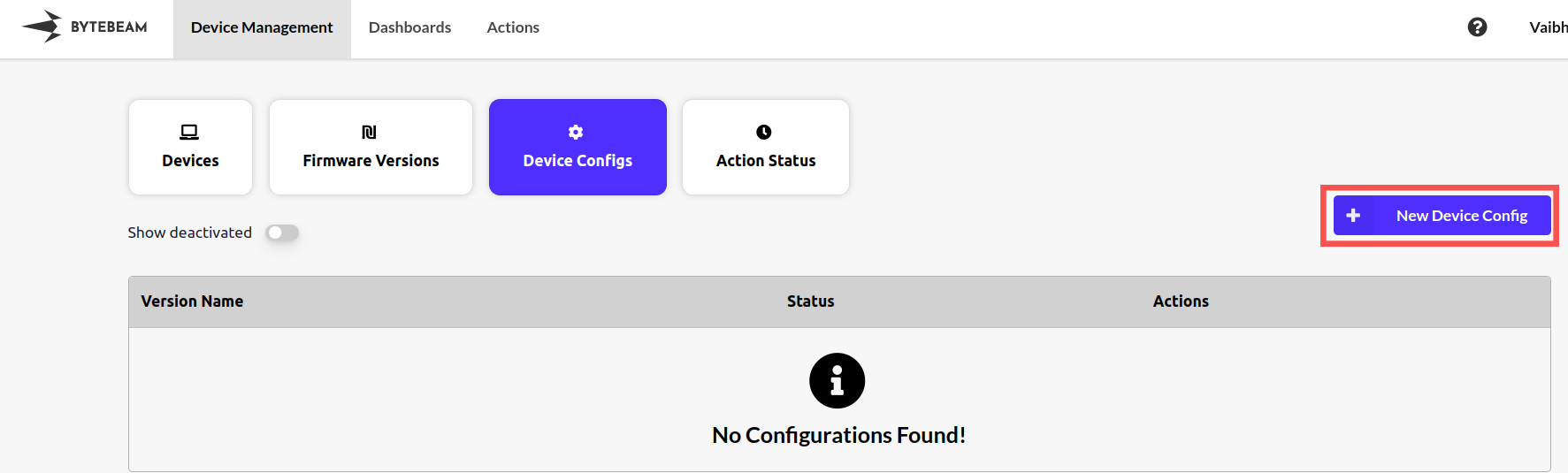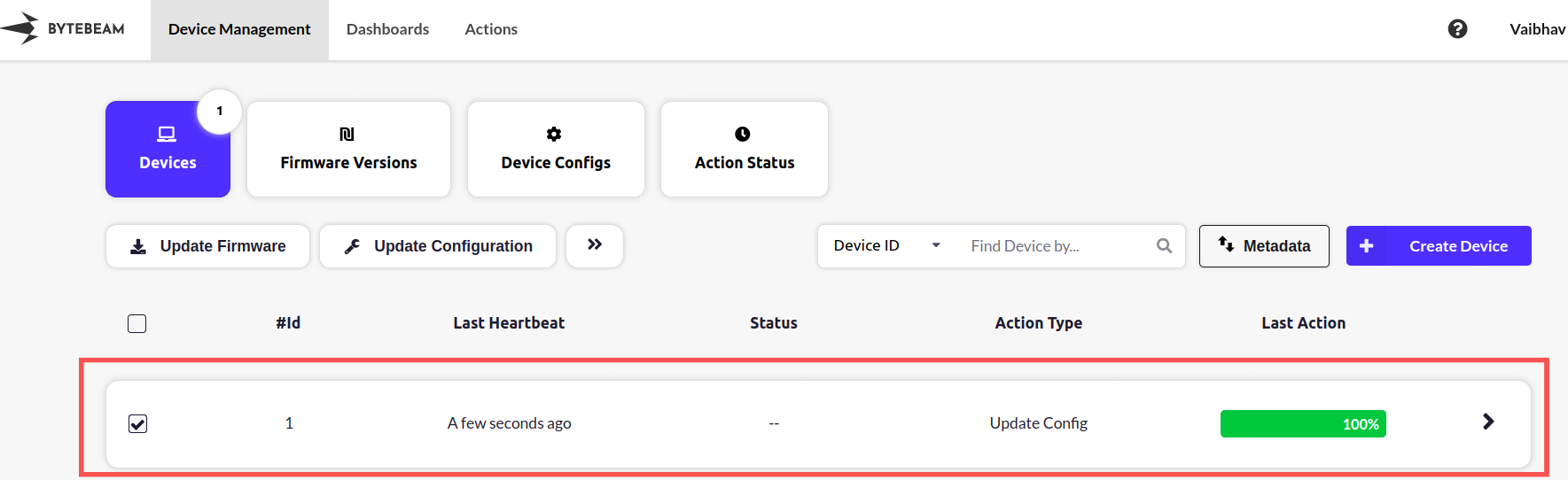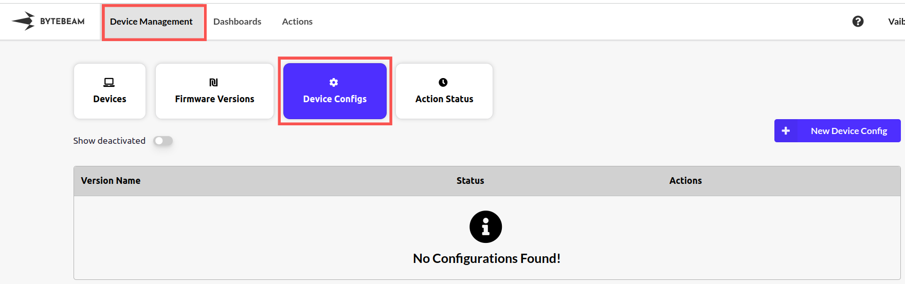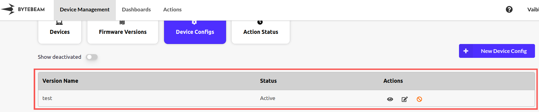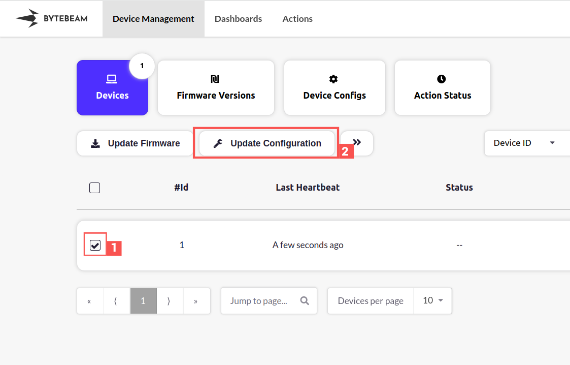 Steps to update configuration: Step 1: Go to the device management section in Bytebeam cloud. Step 2: Go to the “Device Configs” section