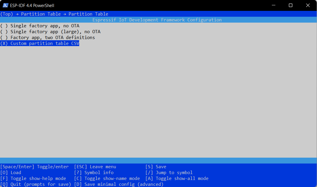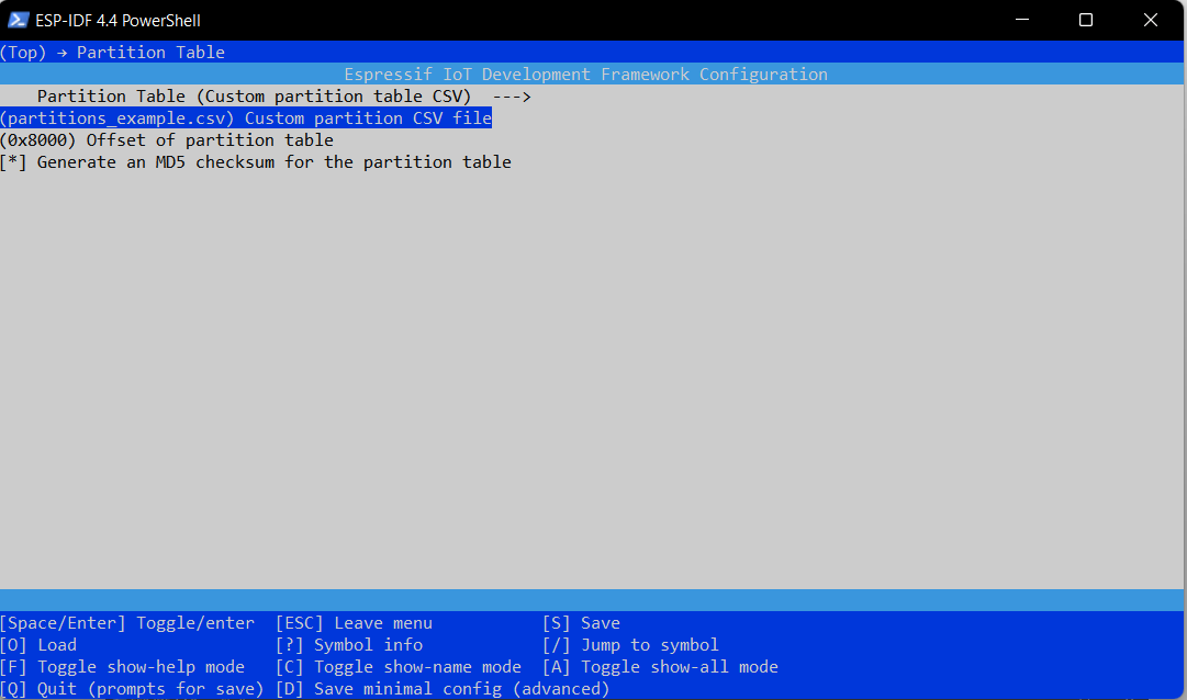 ESCbutton. - Set the name of Custom partition table CSV to partitions_example.csv and press