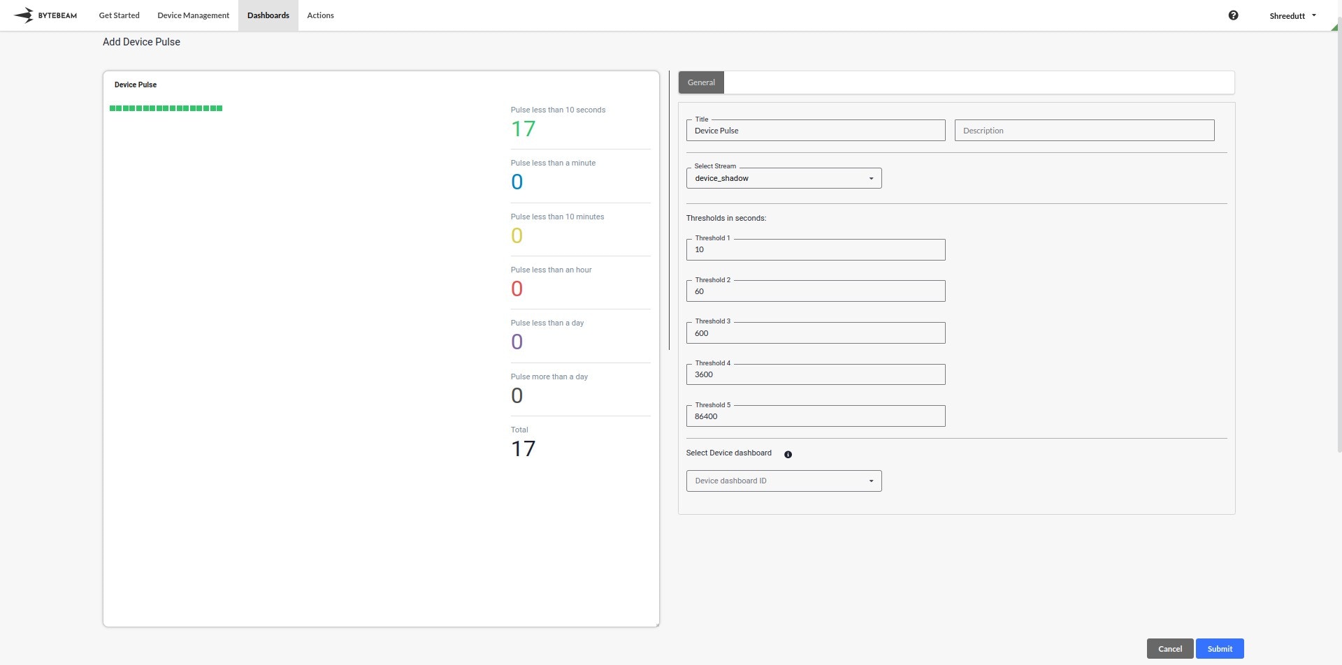 Once all configurations are complete, click Submit to add the Device Pulse Panel to the dashboard.