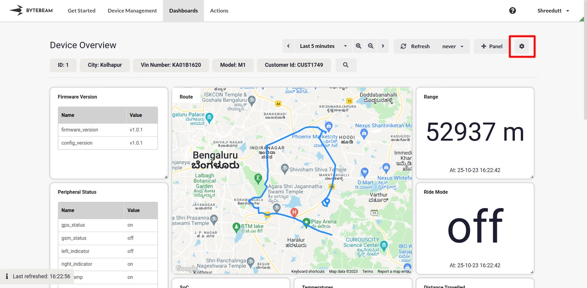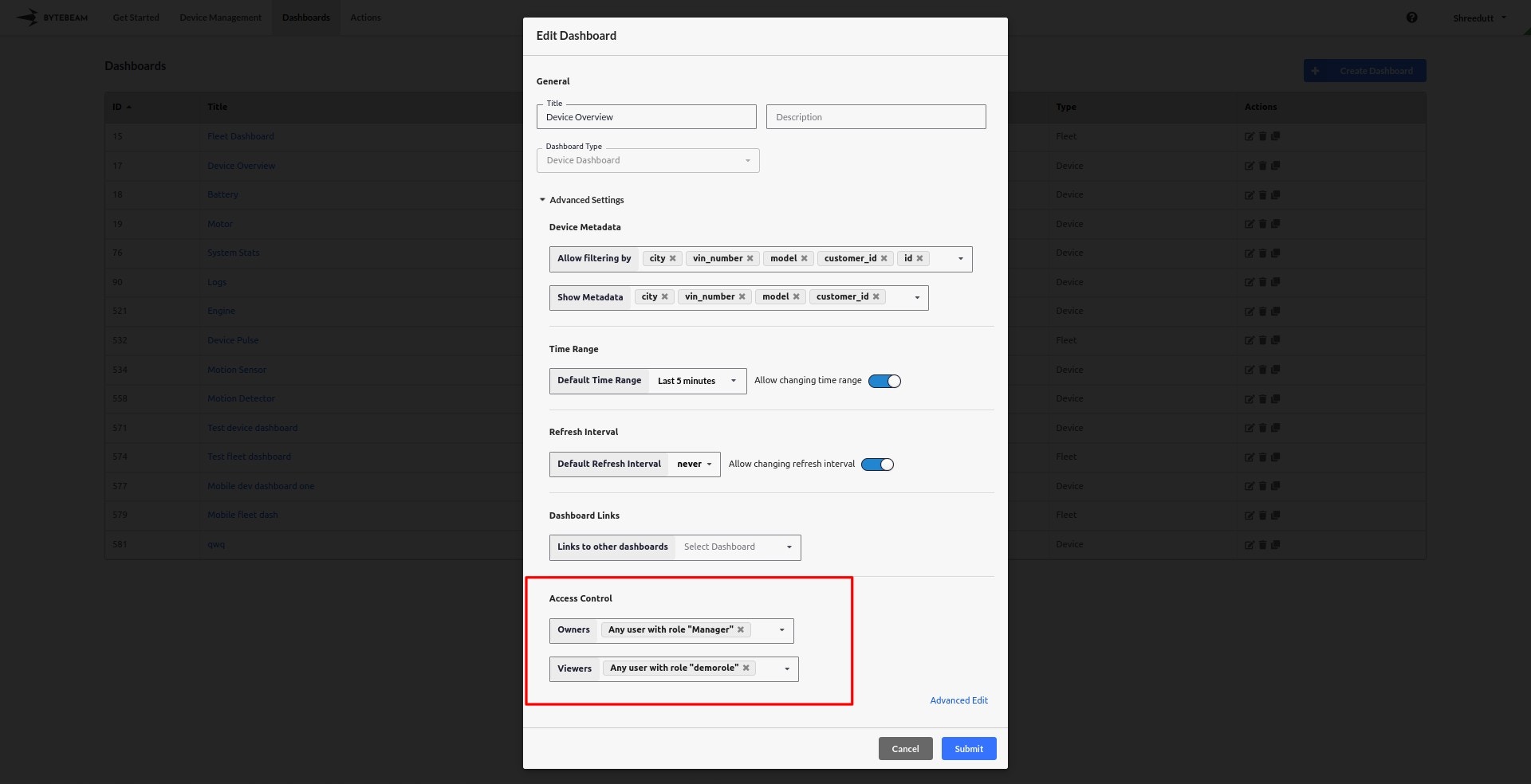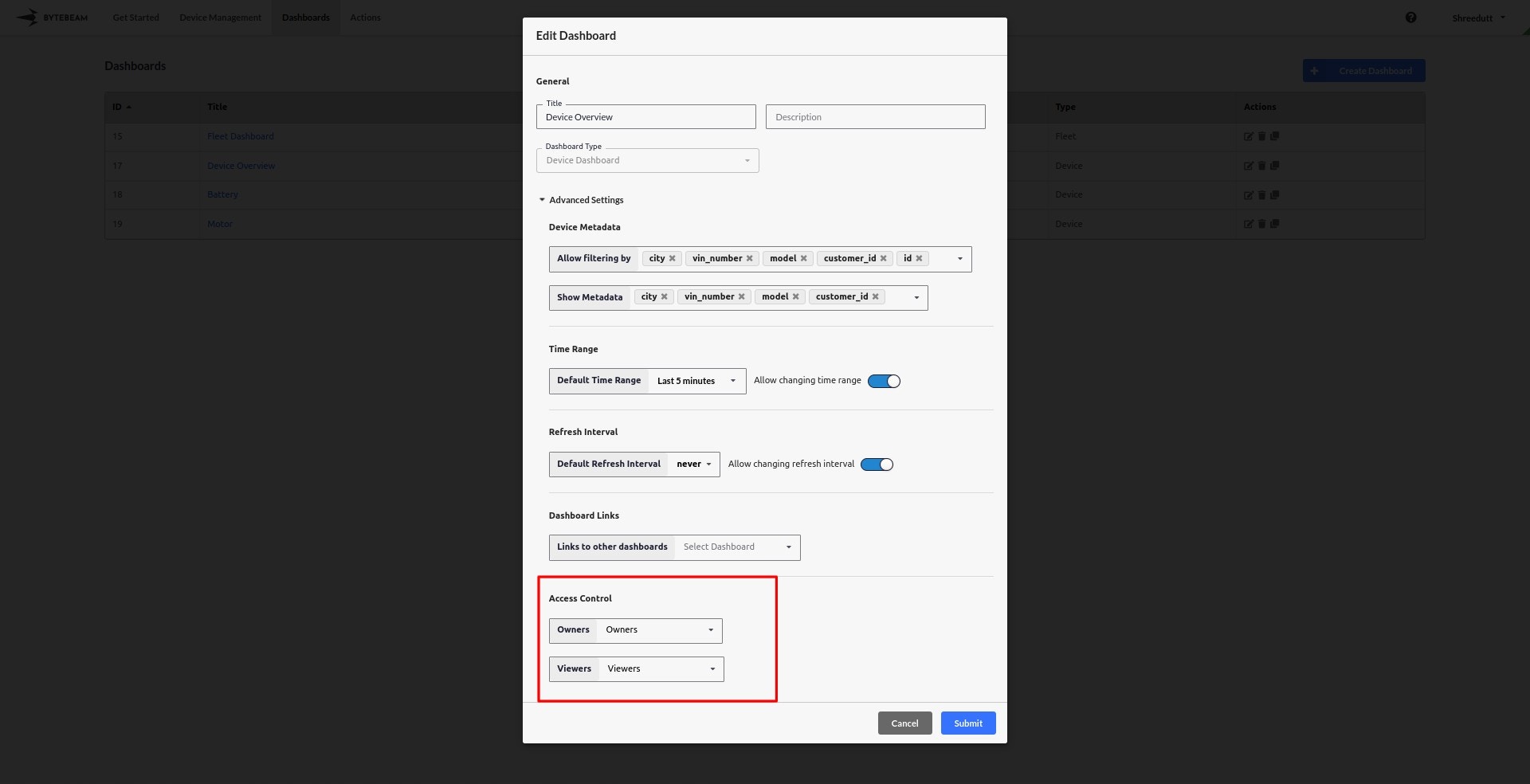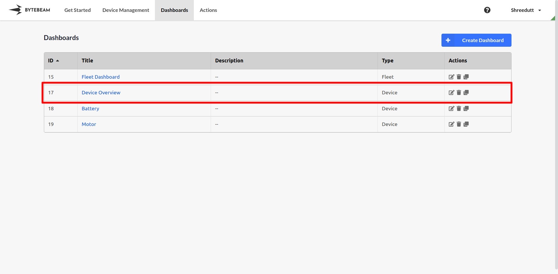 Go to the Dashboards tab in the Bytebeam console and locate the dashboard you want to share.