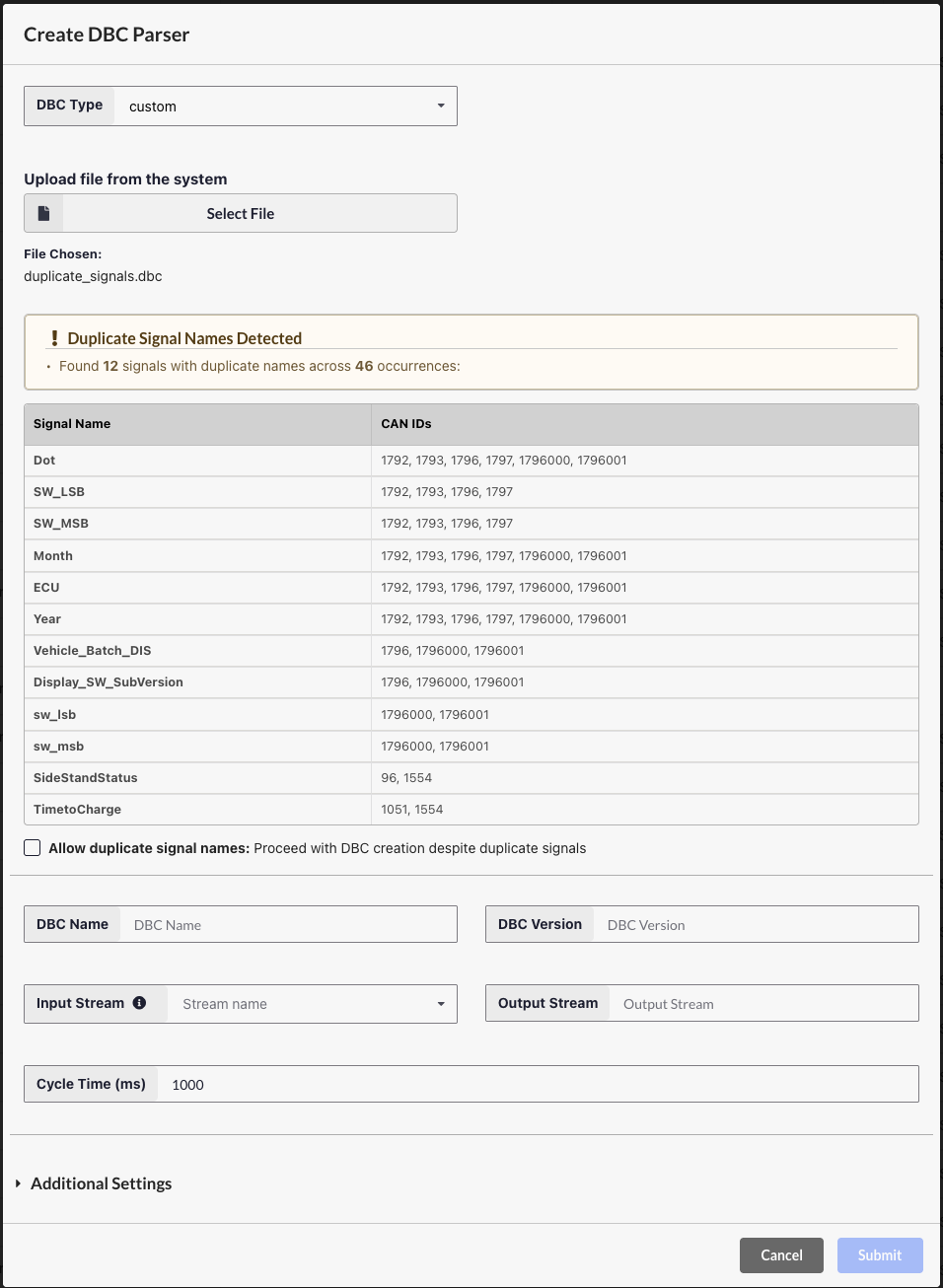 We’ve enhanced the DBC parser workflow to automatically detect and display duplicate signals immediately after the DBC file is uploaded.